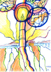 kreisförmigen oder runden Formen. Die erste Zeichnung ist hauptsächlich orange, gelb und grün. Die zweite Zeichnung hat auch einen Leuchtturm in der Mitte, zwei kleine Feuer und den Kopf eines