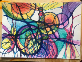"Heute bin ich Heidi Sieber und Dominik Lauber dankbar für die Reise, auf die sie mich in den letzten drei Monaten in Heidis Leuchtturm-Gruppe mitgenommen haben.Ich hatte eigentlich aufgehört, Kunst zu machen. Es ist ungefähr zehn Jahre her, dass ich ein ernsthaftes Kunstwerk gemacht habe. Aber in den letzten drei Monaten habe ich mich in meine Seelenessenz vertieft und mein kreatives Feuer neu entfacht, und ich kann ehrlich gesagt nicht aufhören, Kunst zu machen. Ich habe so viele Ideen, die durch mein Gehirn fließen und wünschte, ich hätte ein zusätzliches Paar Hände, oder vier. Daran arbeite ich im Moment. Es ist das erste einer Reihe von Arbeiten über 'Gott, der in der Rundheit der Dinge gegenwärtig ist', ein Zitat aus Wally Lambs Roman. Ich weiß, dass es so wahr ist." Stephanie Davies